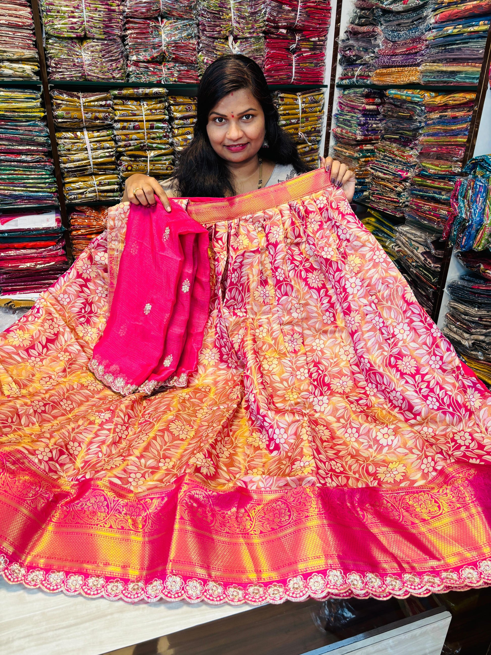 Discover the timeless elegance of Banaras Pattu Lehanga with cut work borders. These Lehanga are skillfully woven with intricate details that elevate their beauty. With a Chinnon duppata included, this stunning lehanga set is perfect for any occasion. Get yours now at an affordable price of 1950/-.