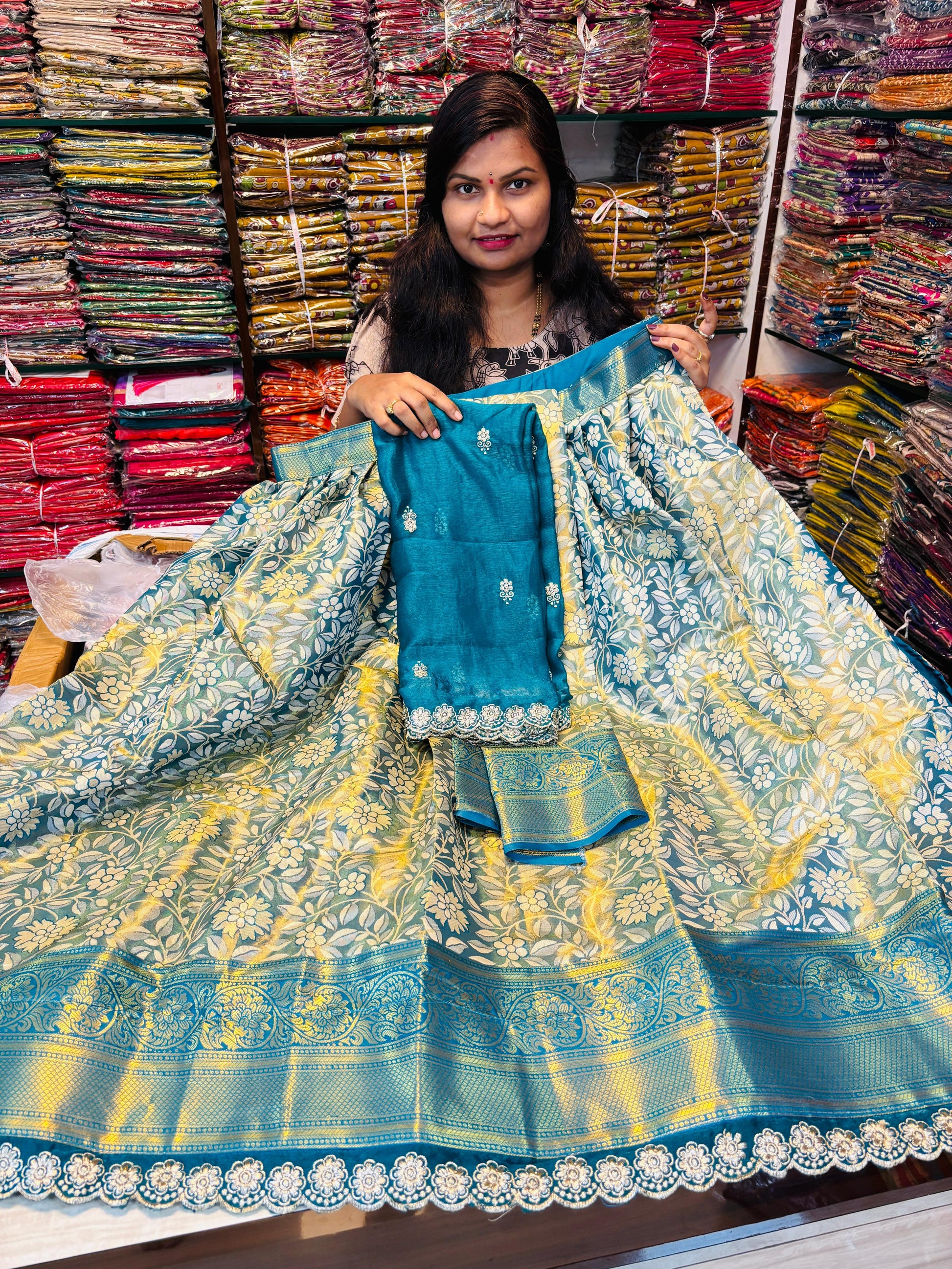 Discover the timeless elegance of Banaras Pattu Lehanga with cut work borders. These Lehanga are skillfully woven with intricate details that elevate their beauty. With a Chinnon duppata included, this stunning lehanga set is perfect for any occasion. Get yours now at an affordable price of 1950/-.