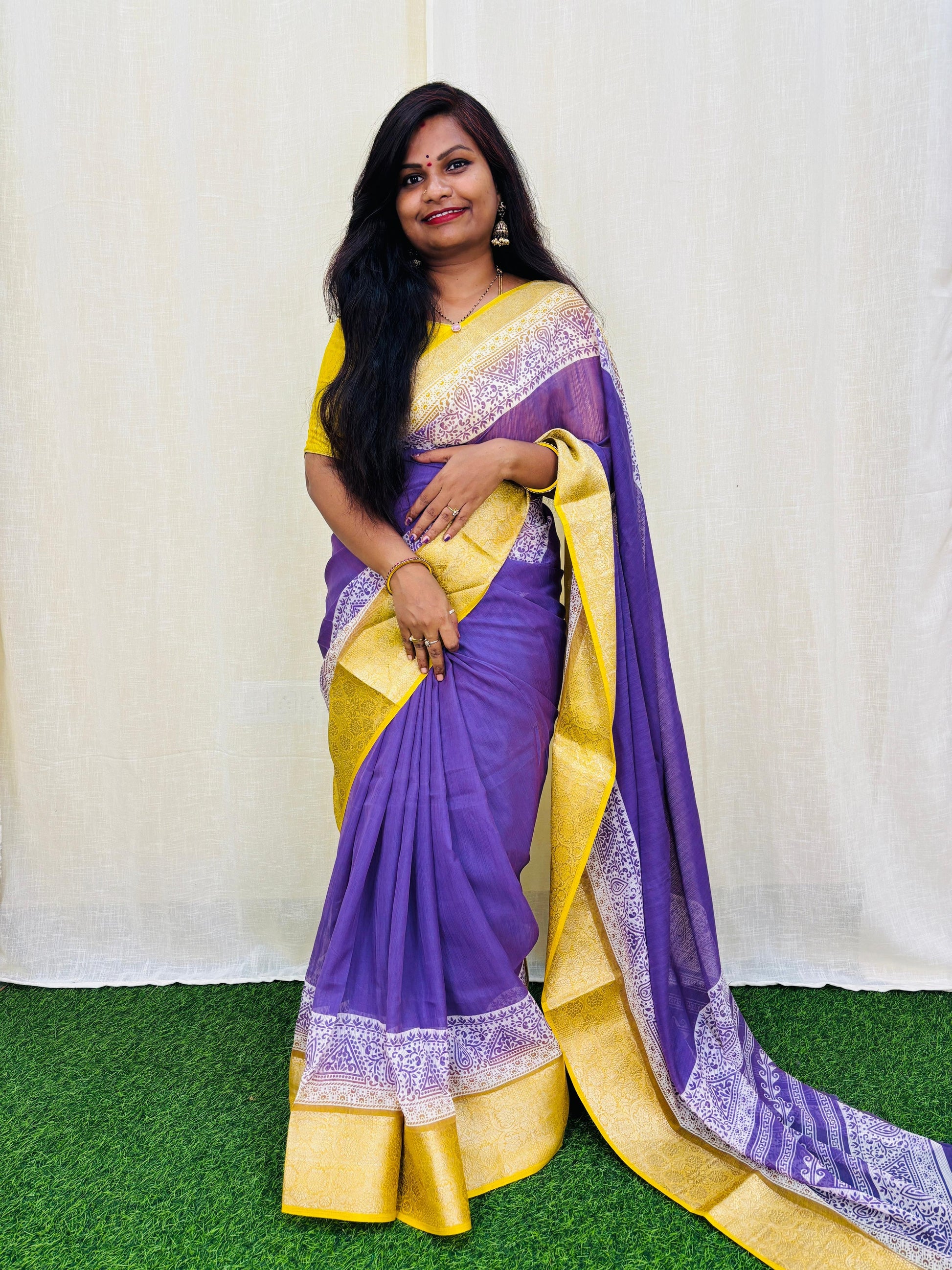 Effortlessly elevate your wardrobe with our Semi Mysore Crepe Silk Sarees. The intricate Azrak borders add a touch of elegance to this luxurious fabric. Made from high-quality silk, experience the smoothness and durability that only our sarees can provide. Discover the perfect blend of style and comfort.