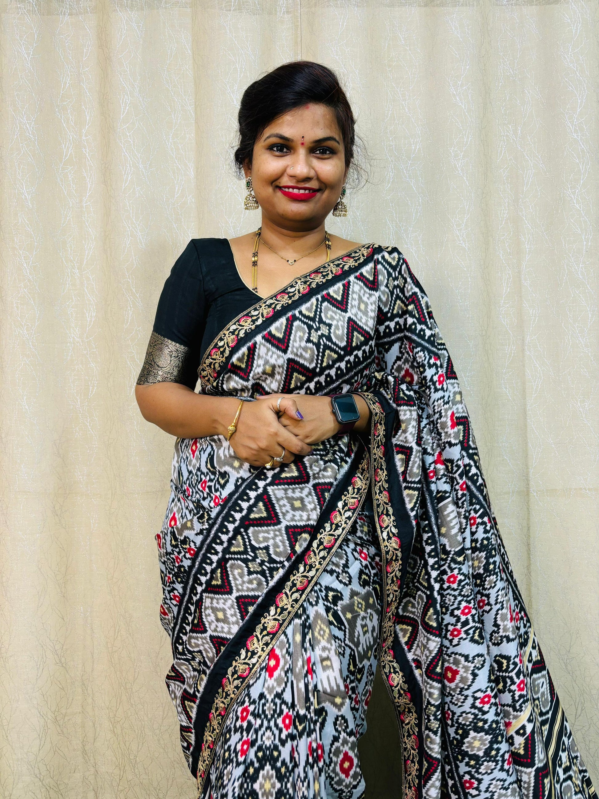 లేస్ వర్క్ బార్డర్లతో సంక్లిష్టంగా డిజైన్ చేయబడిన ఈ సాఫ్ట్ పటోలా ఇక్కత్ ప్రింటెడ్ చీరలు సొగసైన మరియు స్టైలిష్ లుక్ను అందిస్తాయి. మృదువైన మరియు సౌకర్యవంతమైన పదార్థంతో తయారు చేయబడిన ఈ చీరలు సౌకర్యం మరియు శైలి రెండింటినీ అందిస్తాయి. ఏ సందర్భానికైనా పర్ఫెక్ట్, ఈ బహుముఖ భాగాన్ని ఈరోజు మీ వార్డ్రోబ్కి జోడించండి.