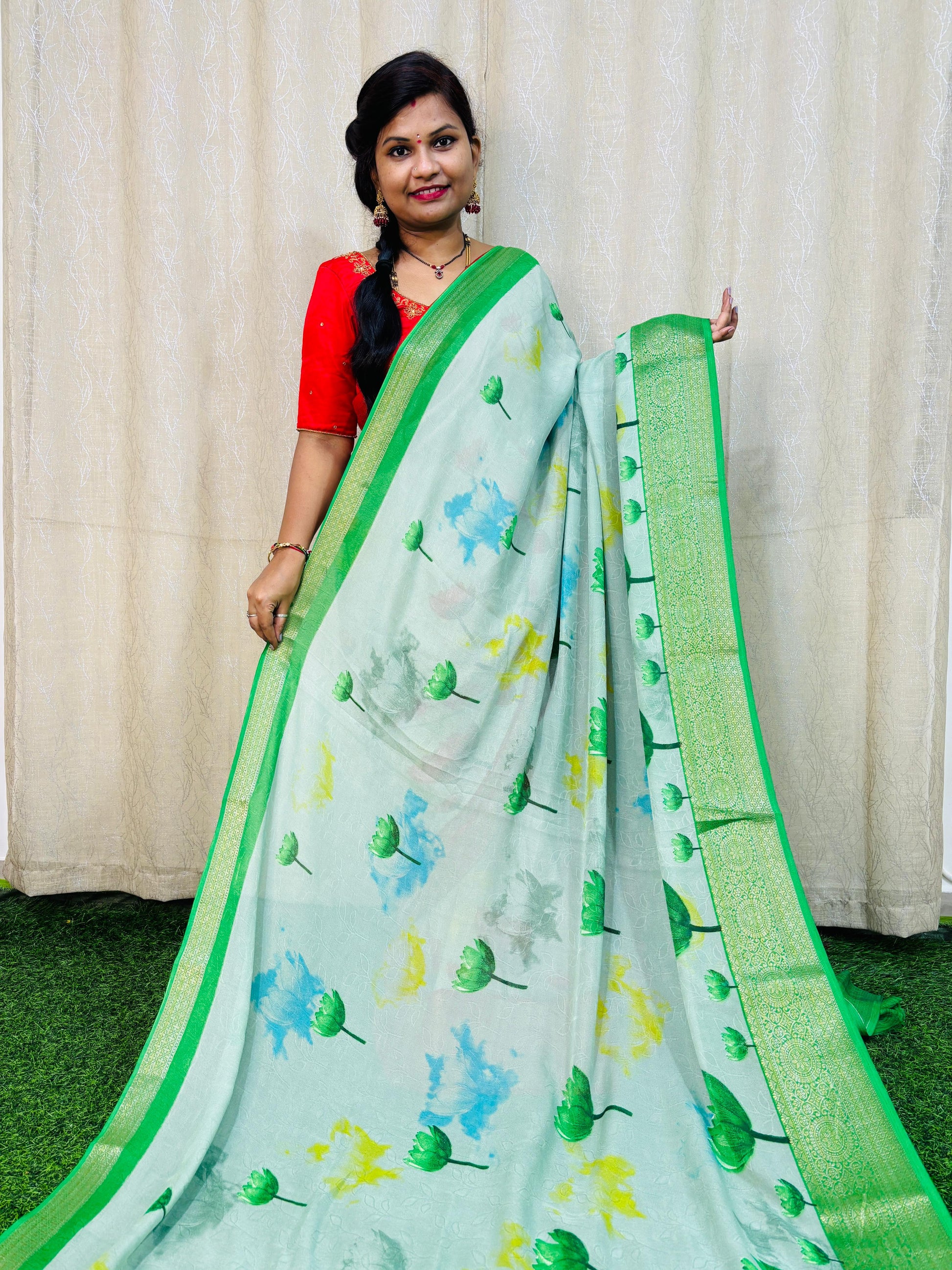మా టై అండ్ డై షిఫాన్ జార్జెట్స్ చీరతో మీ శైలిని మరింత అందంగా తీర్చిదిద్దుకోండి. అద్భుతమైన లోటస్ పిచ్వై డిజైన్ మరియు గొప్ప కలంకారి పల్లుతో కూడిన ఈ చీర ఏ సందర్భానికైనా సరైనది. అధిక-నాణ్యత పదార్థాలతో తయారు చేయబడిన ఇది చక్కదనం మరియు సౌకర్యాన్ని అందిస్తుంది. మరియు కేవలం 950/- వద్ద, ఇది అజేయమైన విలువ.