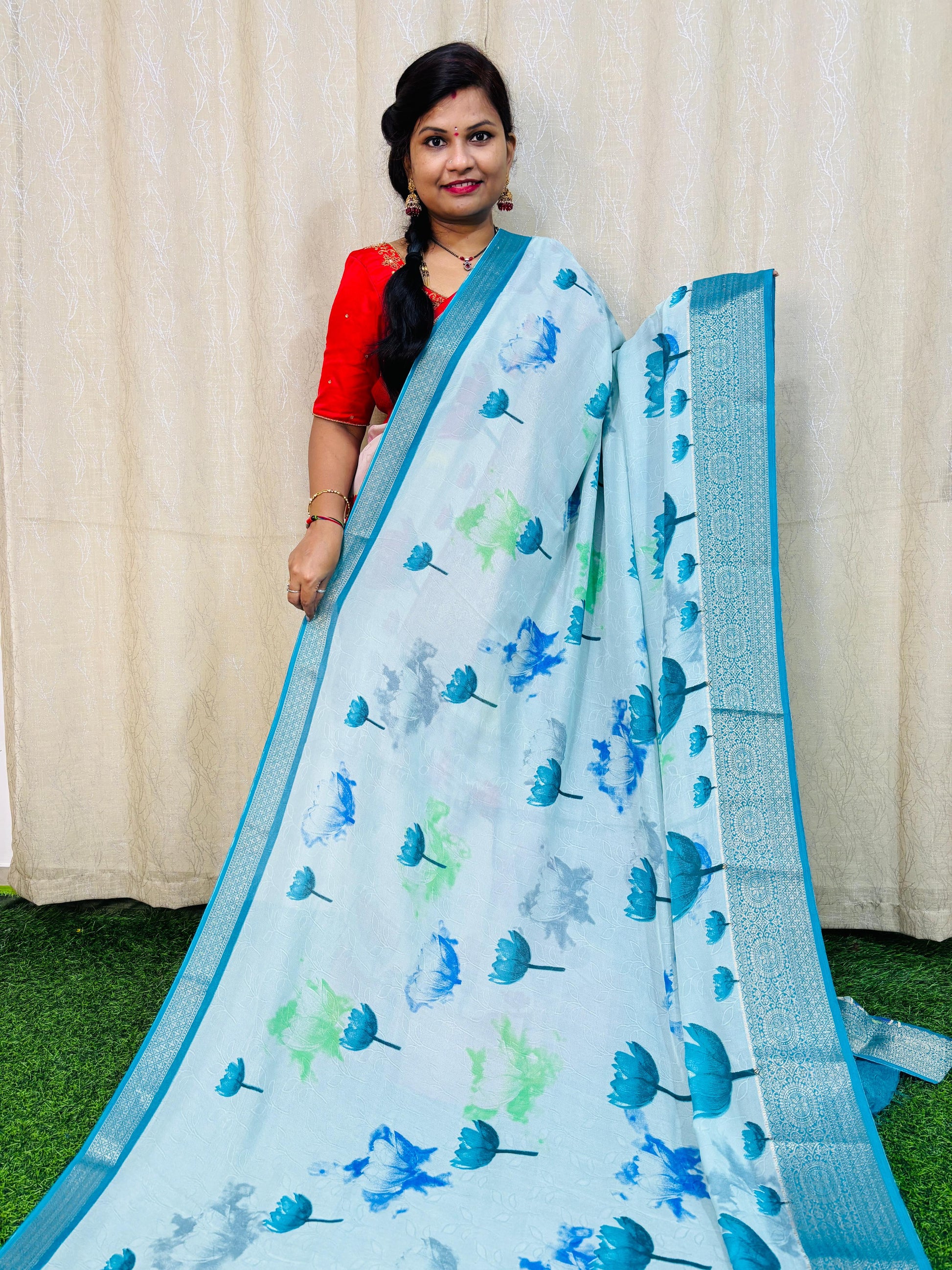 మా టై అండ్ డై షిఫాన్ జార్జెట్స్ చీరతో మీ శైలిని మరింత అందంగా తీర్చిదిద్దుకోండి. అద్భుతమైన లోటస్ పిచ్వై డిజైన్ మరియు గొప్ప కలంకారి పల్లుతో కూడిన ఈ చీర ఏ సందర్భానికైనా సరైనది. అధిక-నాణ్యత పదార్థాలతో తయారు చేయబడిన ఇది చక్కదనం మరియు సౌకర్యాన్ని అందిస్తుంది. మరియు కేవలం 950/- వద్ద, ఇది అజేయమైన విలువ.