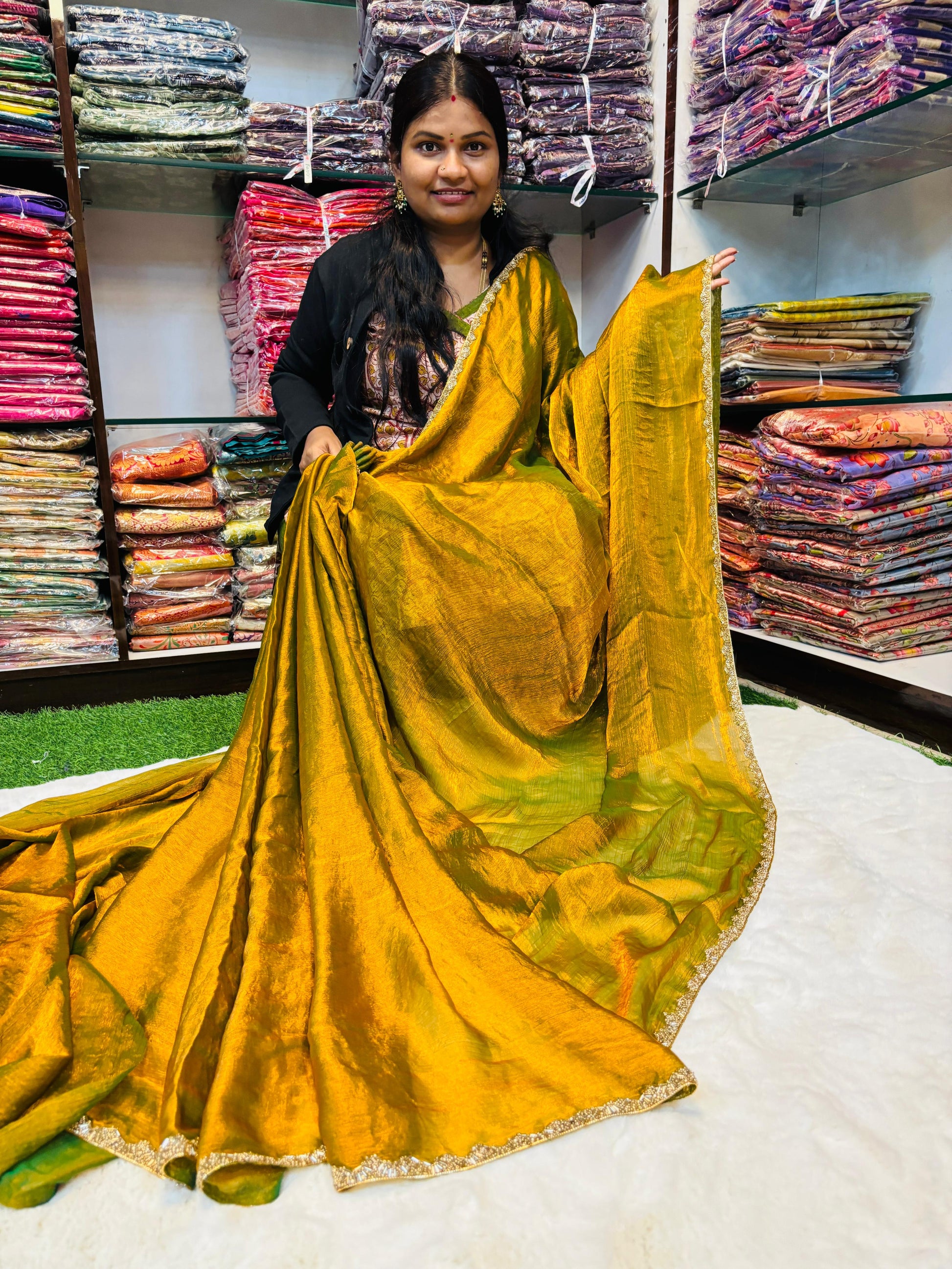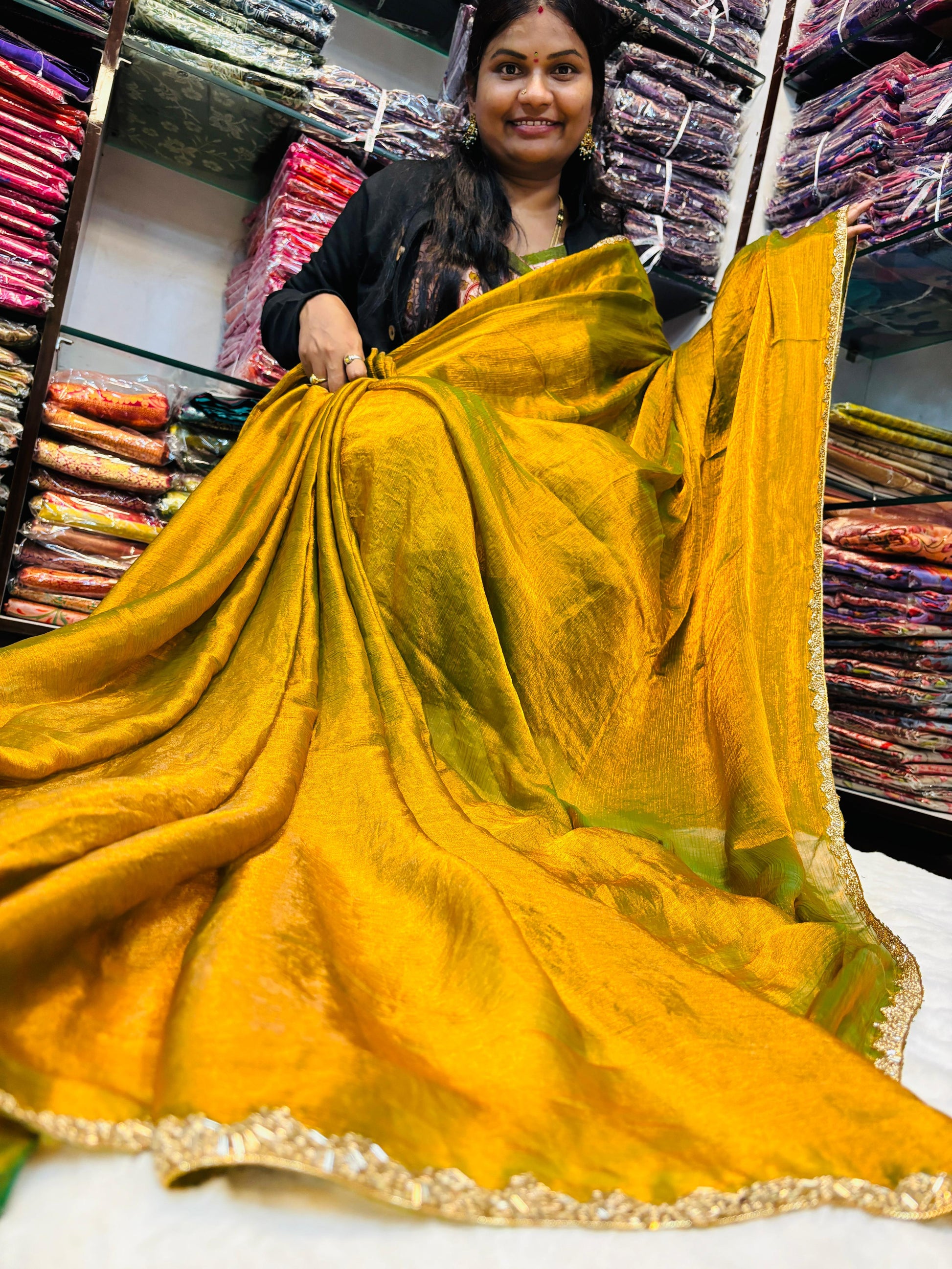 Tissue Crush is the ultimate trendy statement piece, featuring all over zardosi karddana work and a self blouse. Elevate any outfit with this must-have fashion item.