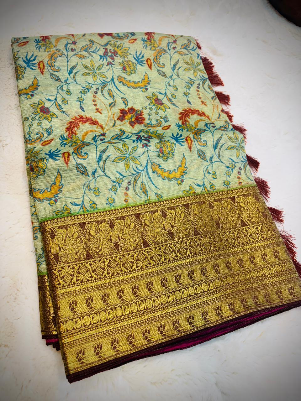These tissue Kanchi borders add a touch of elegance to any clothing or fabric. Made with intricate craftsmanship, they feature delicate designs and vibrant colors, enhancing the aesthetic appeal of the product. Perfect for traditional outfits, these borders are sure to elevate the overall look and feel.