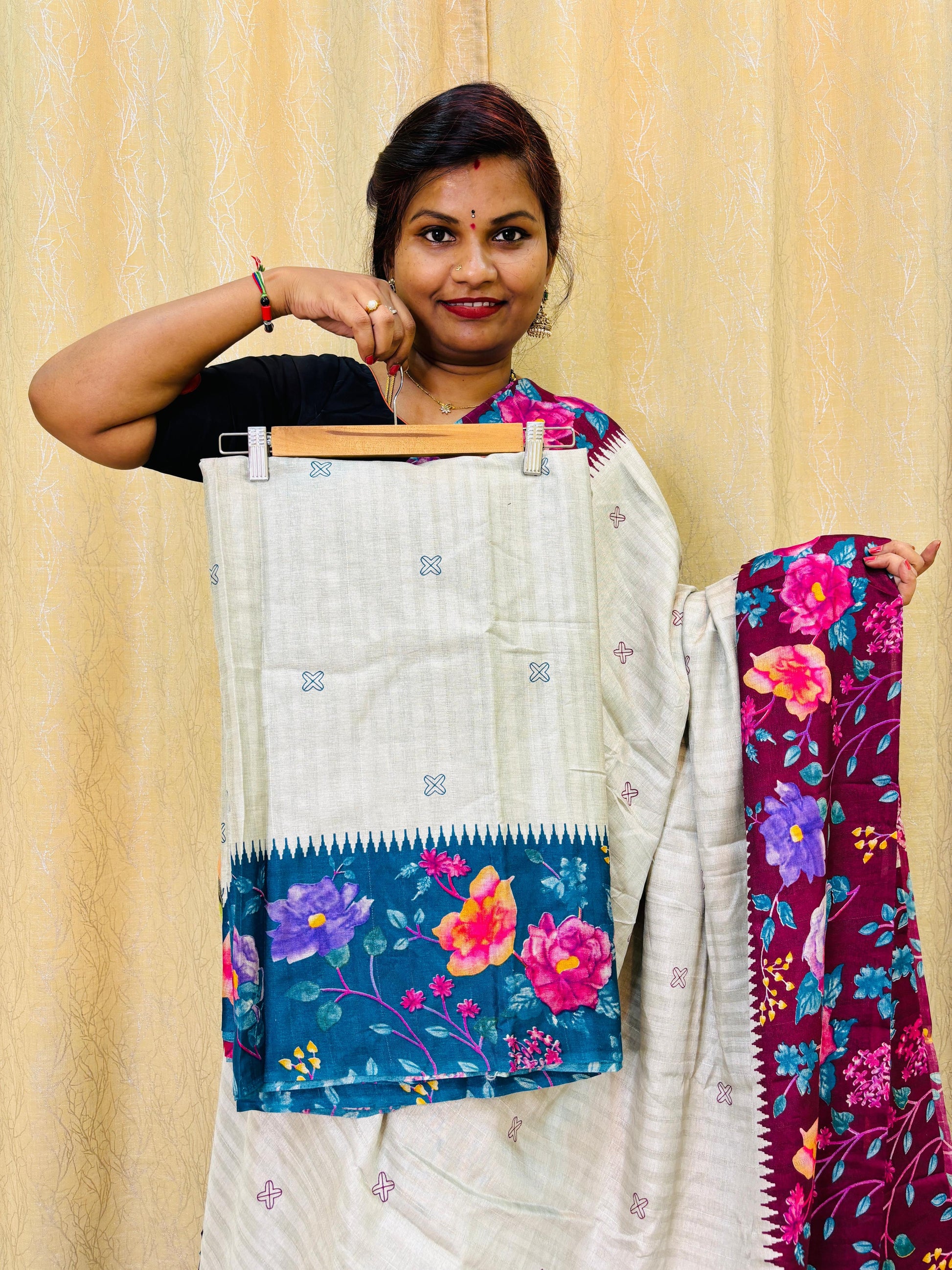 Expertly crafted with high-quality Tusser silk, this luxurious fabric boasts a stunning floral border design. Enjoy the elegant and sophisticated look that this premium material brings to any outfit. Perfect for adding a touch of opulence to your wardrobe.