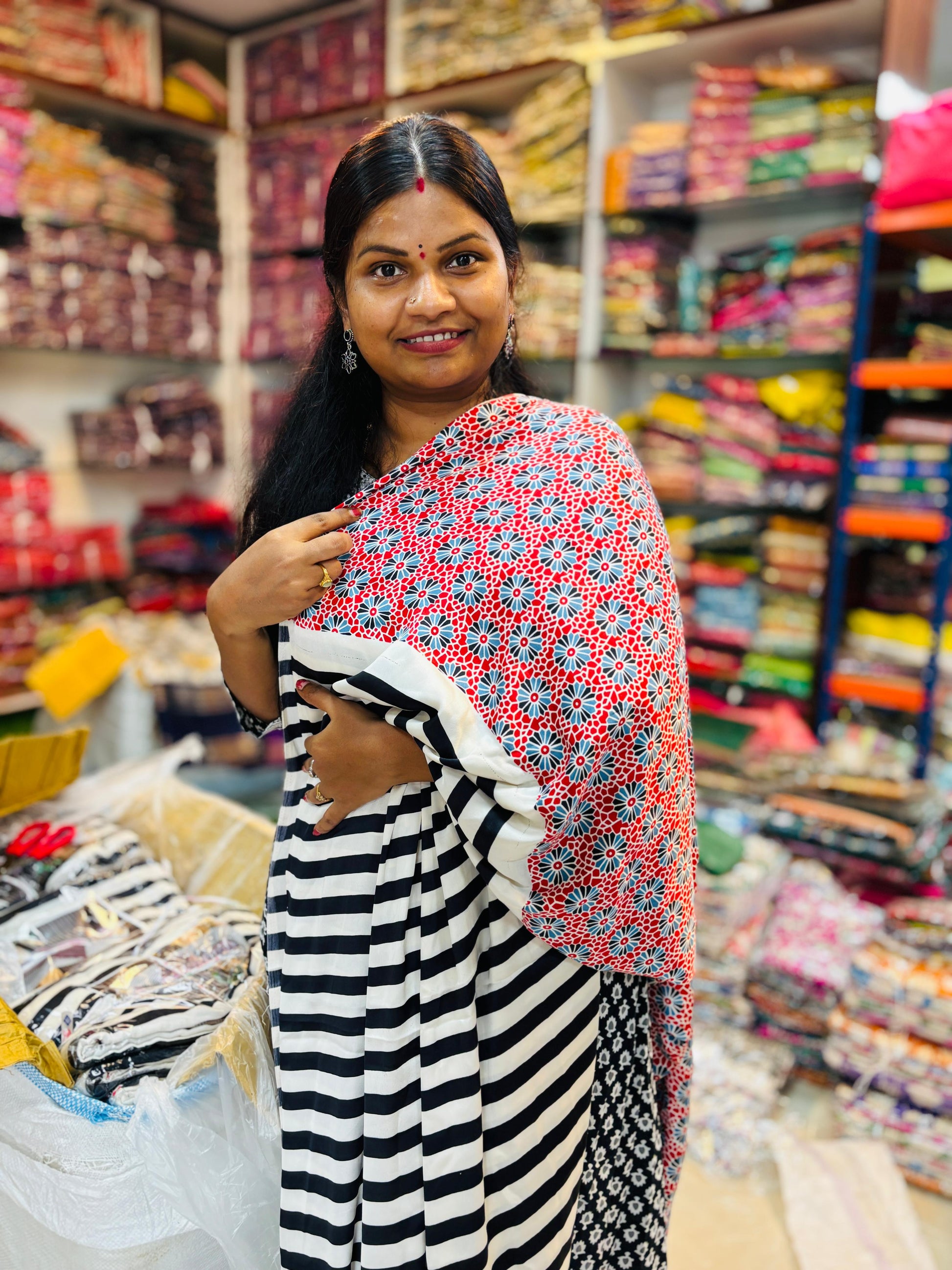 This Ajrakh Modal Silk saree features a beautiful Ajrakh pallu and comes with a contrasting Ajrakh blouse. The absence of tassels adds a touch of elegance to this eye-catching piece. Perfect for any occasion, this saree combines traditional design with modern comfort.