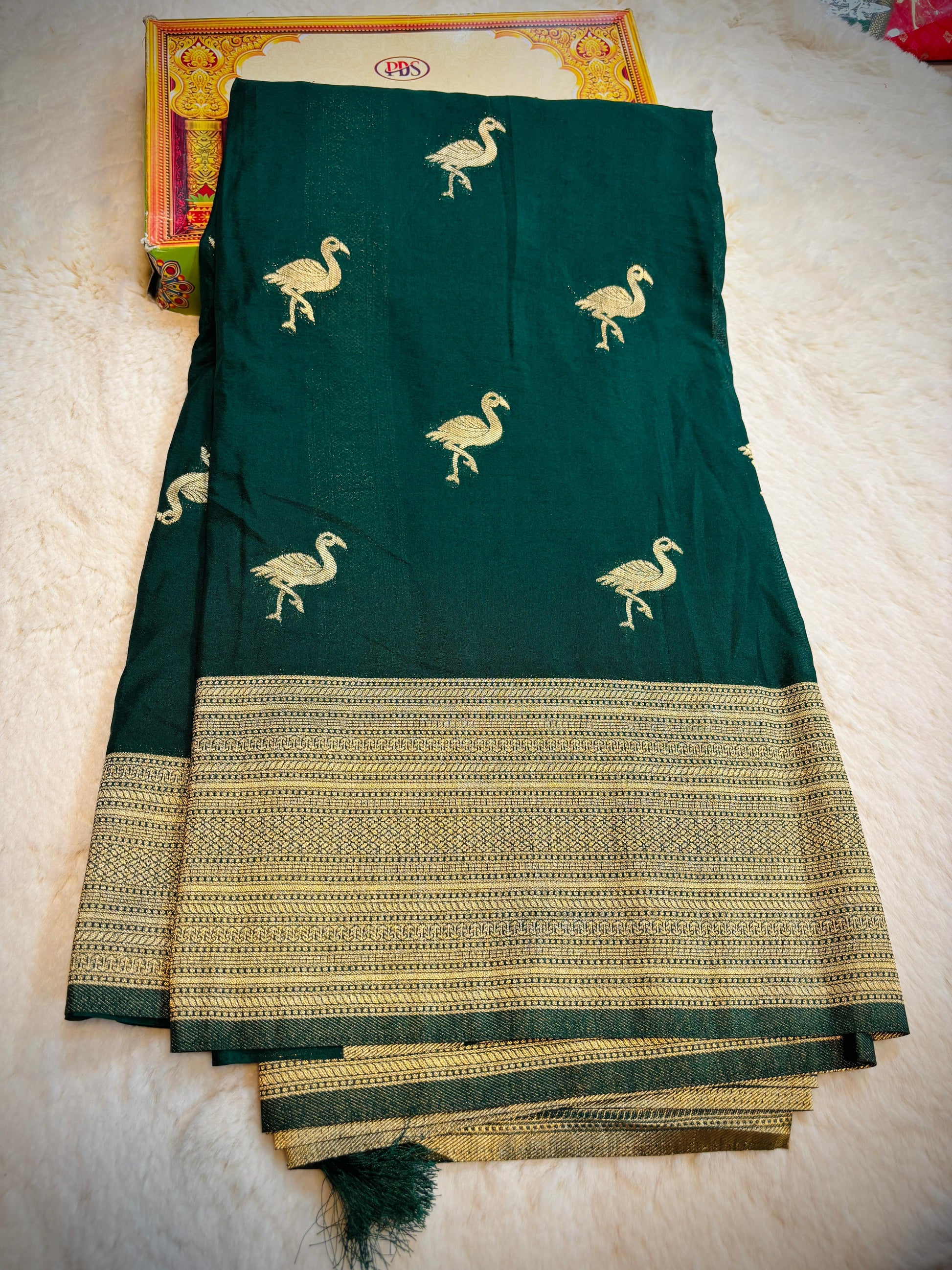 Raw Mango Pattu saree boasts exquisite all-over weavings, adding a touch of opulence to its timeless design. Handcrafted with precision, it offers a luxurious drape and is sure to make a statement at any occasion. Elevate your wardrobe with this high-quality, traditional garment.